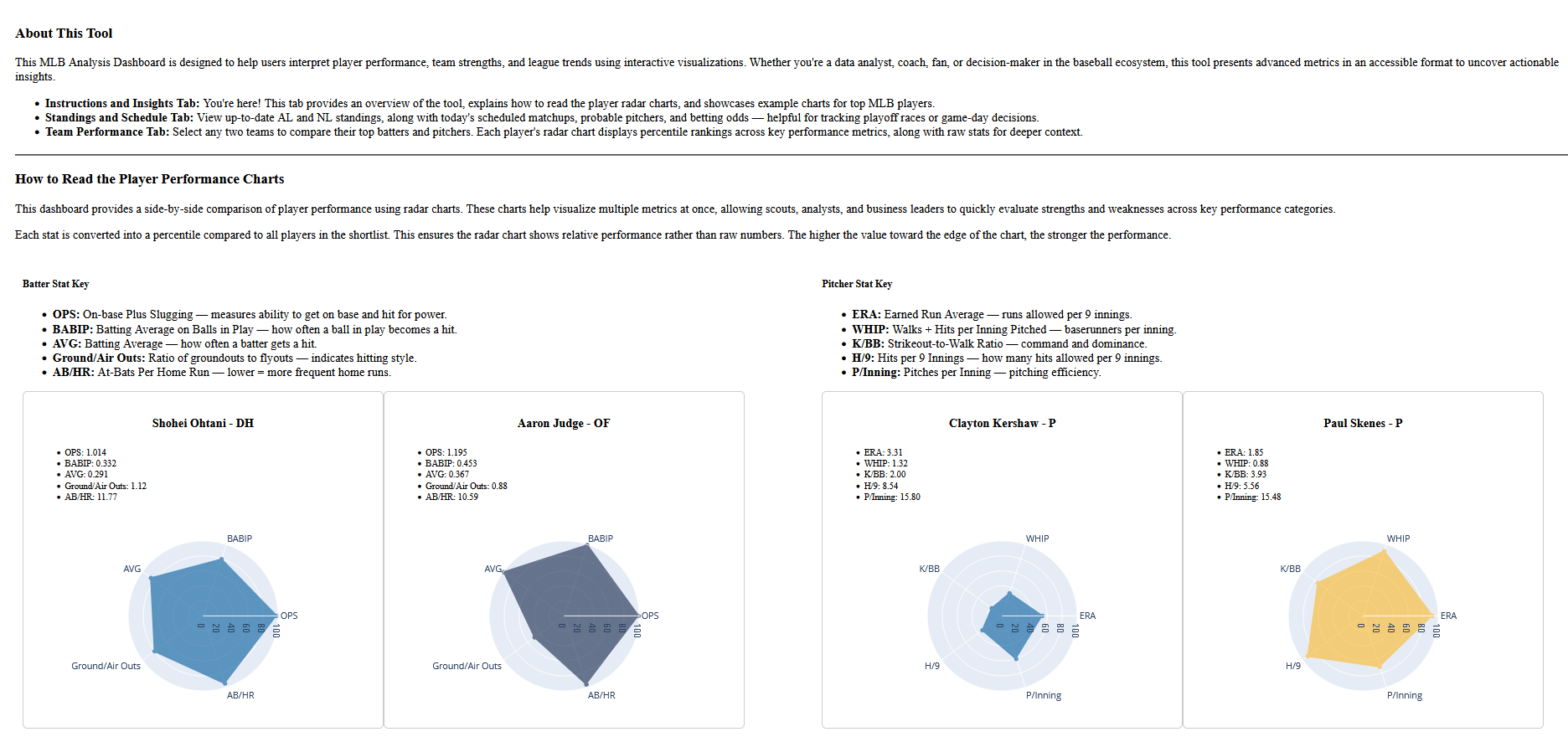 This web app centralizes curated MLB data into one clean, interactive platform — built for sports bettors, fantasy players, and stat-minded fans. Whether you're analyzing trends, comparing match-ups, or looking for an edge before placing a bet, the dashboard puts powerful insights at your fingertips.